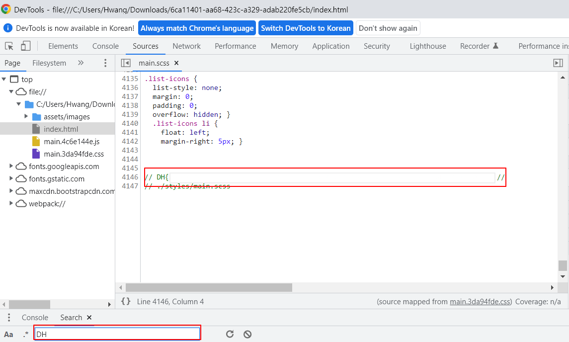 개발자 도구를 사용에서 Ctrl + Shift + F 키를 눌러 전체 검색으로 DH를 검색하면 DH정보를 빠르게 찾을 수 있습니다.