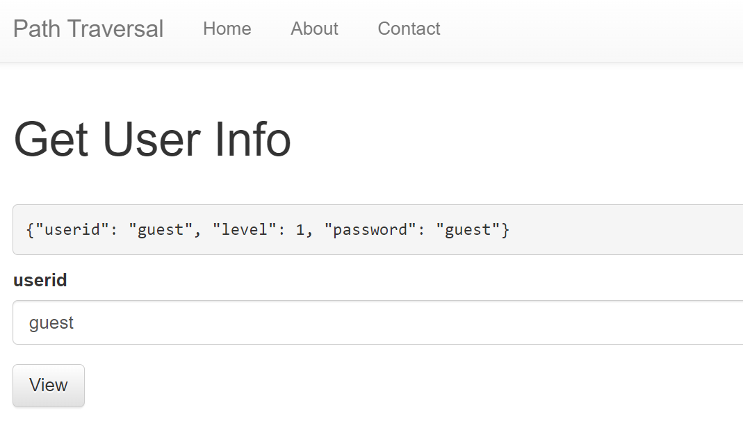 userid에 "guest" 문자열을 입력해서 View 버튼을 누르면 userid, level, password의 value 값이 보인다.