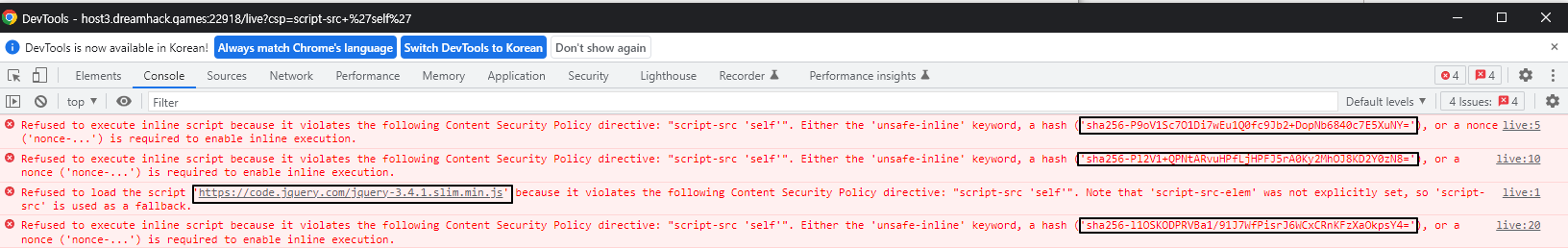 CSP 정책을 script-src 'self' 구문을 넣었을 때, 화면은 빈 페이지만 나와서 개발자모드로 오류메시지를 보니 해시값으로 설정된 script와 CDN으로 불러온 jquery가 로드가 안된다는 오류메시지이다.