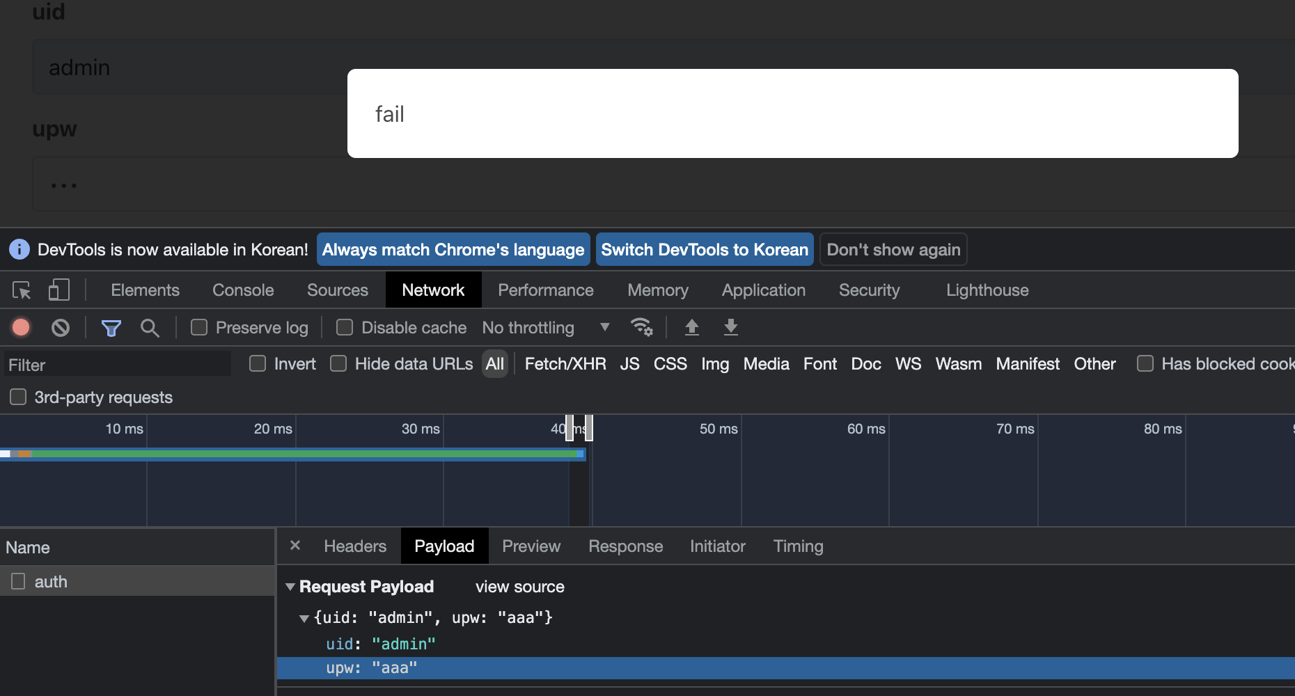 uid에 "admin" 을 넣고 upw에 "aaa" 넣었을 때의 페이로드이다.