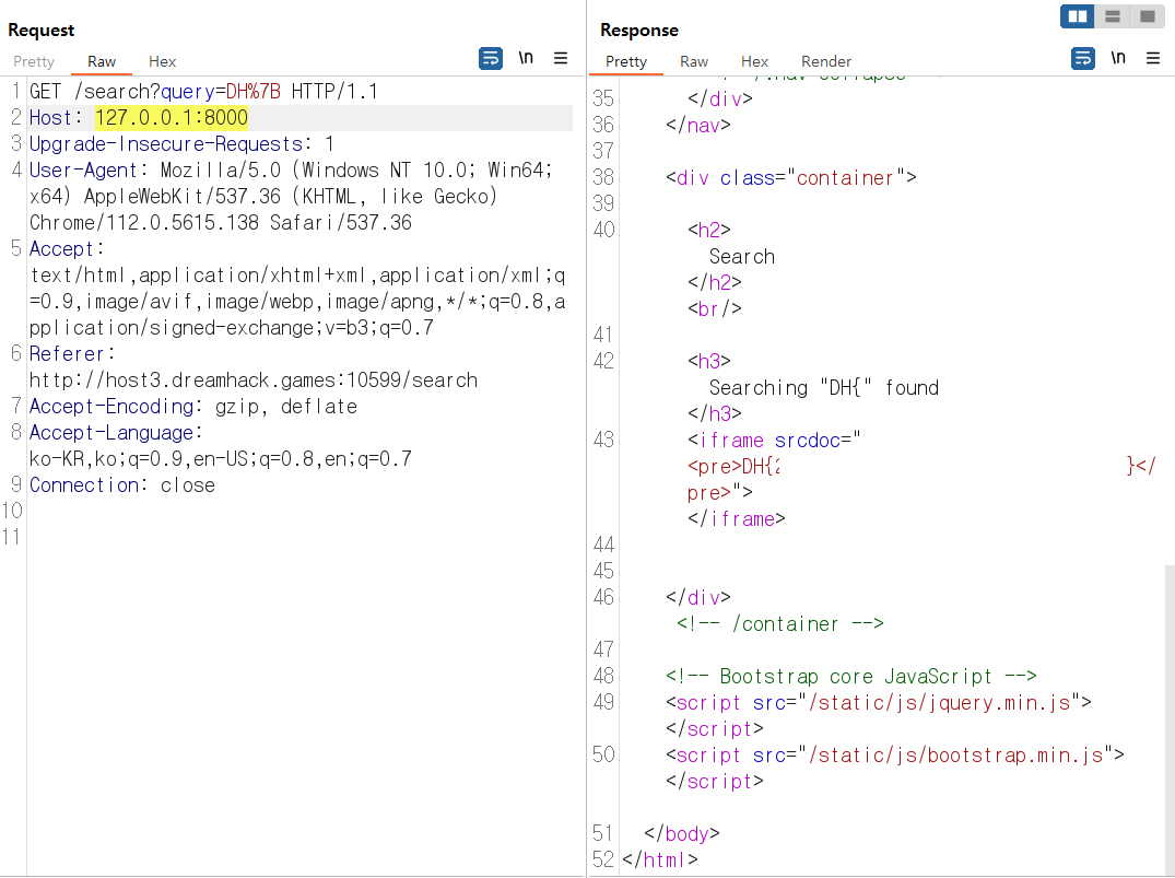 버프를 사용해 HOST 값을 127.0.0.1:8000로 수정을 해주고 요청을 보내니까 응답값에 flag 값이 출력이 된다.