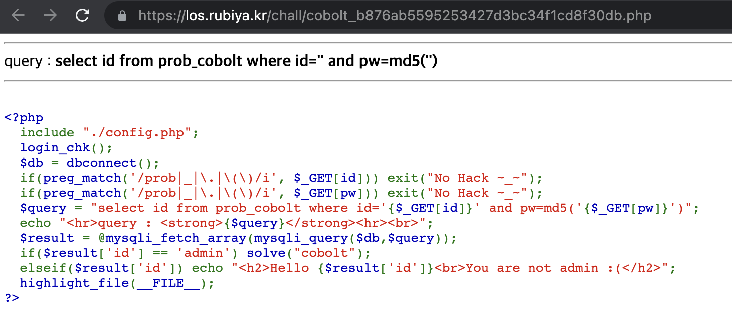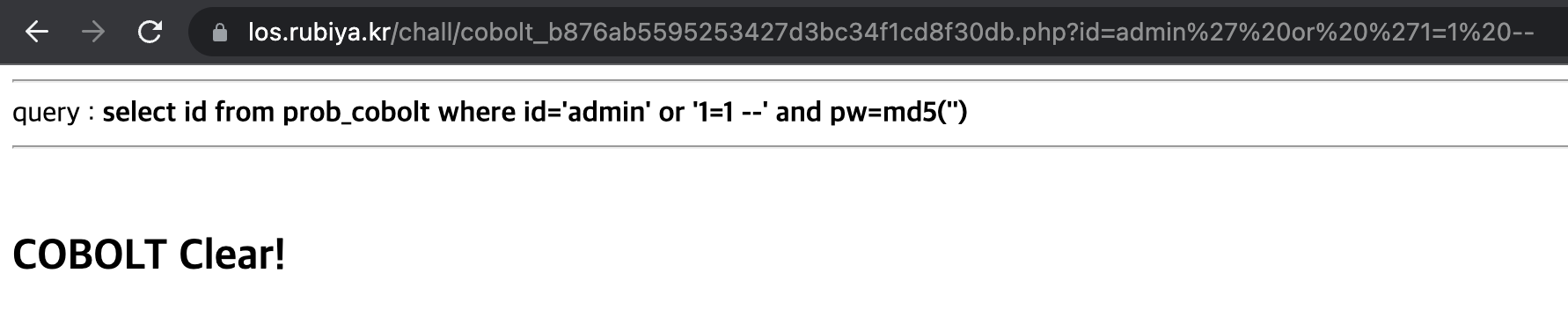 select id from prob_cobolt where id ='admin' or '1=1 --' and pw=md5('') 구문에서 --으로 pw를 주석 처리 해줌