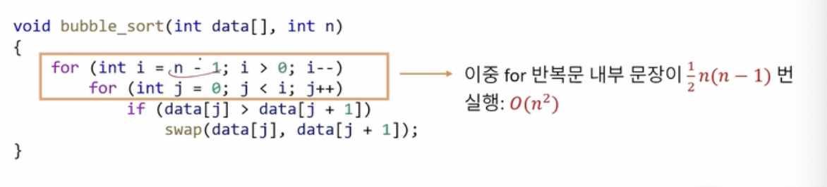 - 실행 시간 측정 방법의 한계 : 알고리즘을 구현한 프로그램의 실행 시간은 실행 환경(하드웨어, 운영체제, 언어, 컴파일러 등)에 따라 달라지므로 절대적인 실행 시간 비교는 파악에 한계가 있음