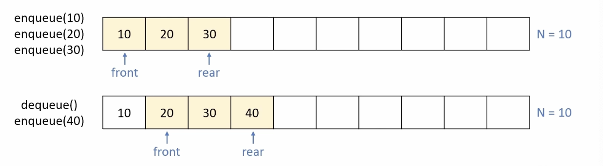 - 미리 정해진 크기의 배열을 할당하고, 큐의 앞과 뒤를 나타내는 front와 rear변수를 사용