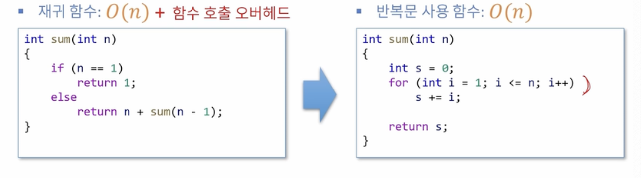 - 모든 재귀 함수는 반복문을 사용하는 함수로 변환 가능