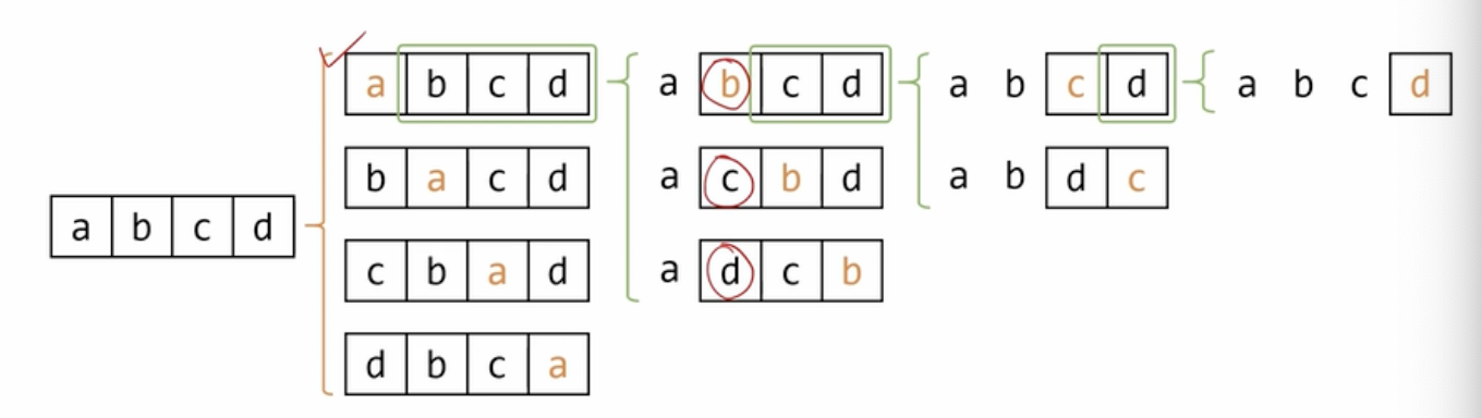 1. 첫 번째 원소를 모든 원소와 각각 맞바꾸기(swap)