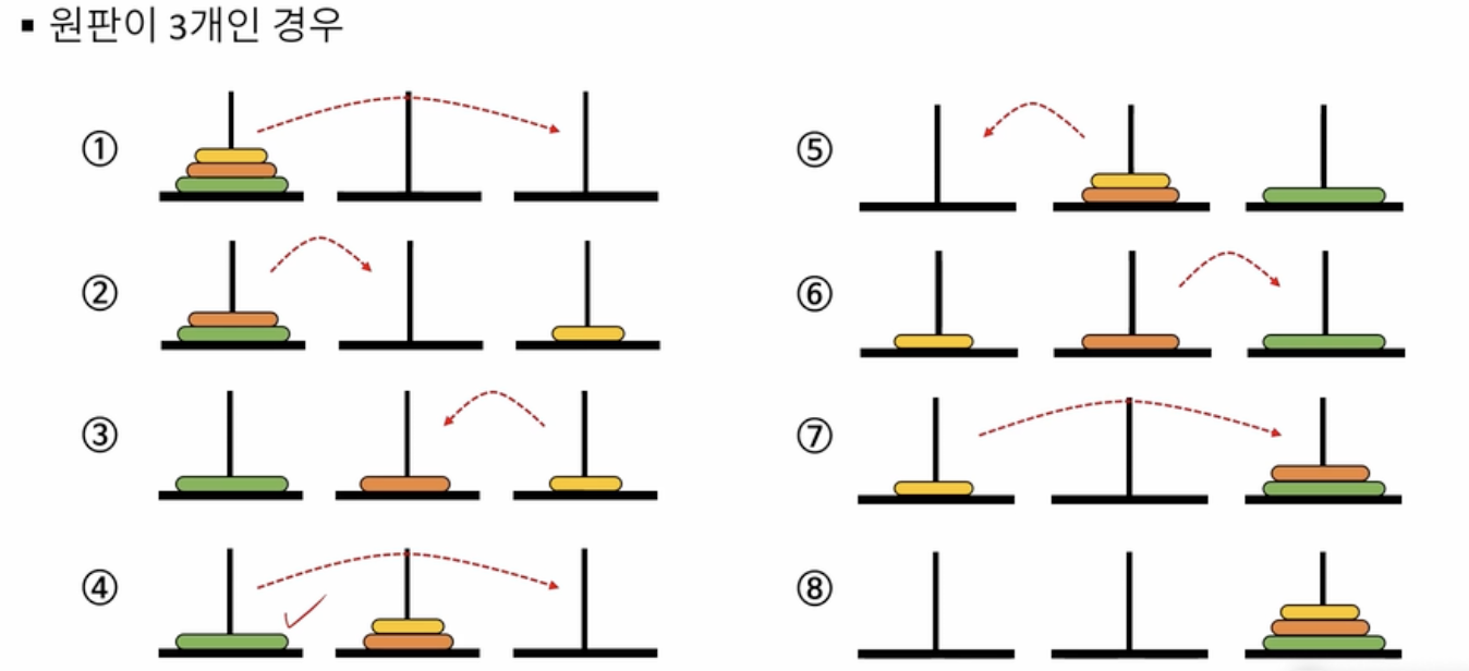 2. 기둥의 맨 위에 있는 원판을 다른 기둥의 맨 위로 옮길 수 있다.
