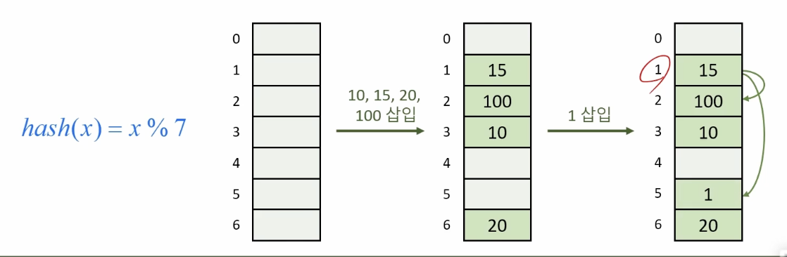 - 특정 해시 갑에서 충돌이 발생하면 해당 위치에서 하나씩 다음 위치로 이동하면서 비어 있는 위치에 원소를 삽입