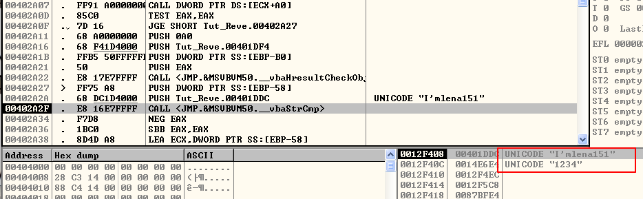 F8로 한 단계씩 실행시키다 보면 스택에 내가 입력한 1234랑 I'mlena151이랑 비교를 하는 거 같다.
