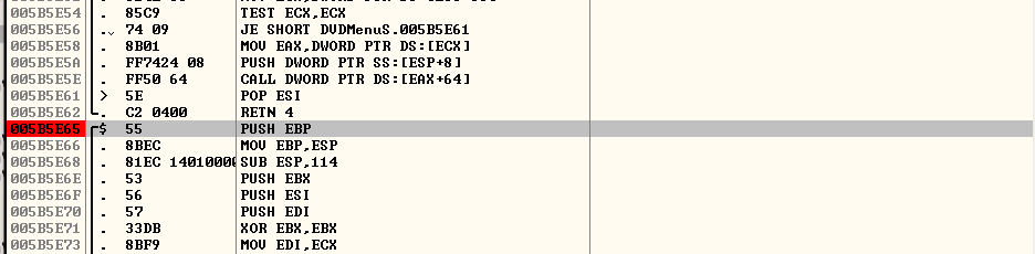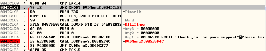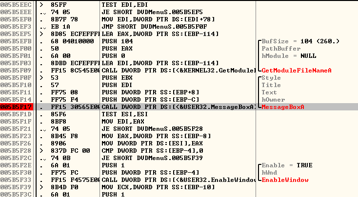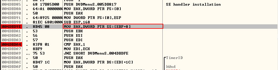 메시지 박스 출력호출하는 앞부분에 브레이크 포인트를 걸어서 분석을 해보자.