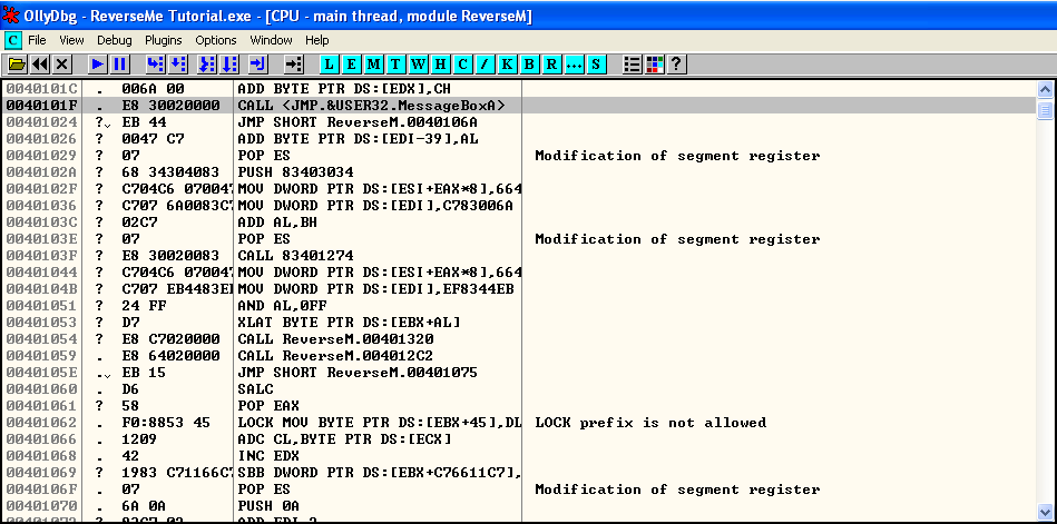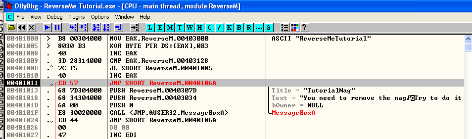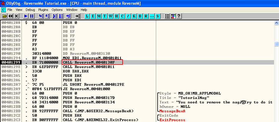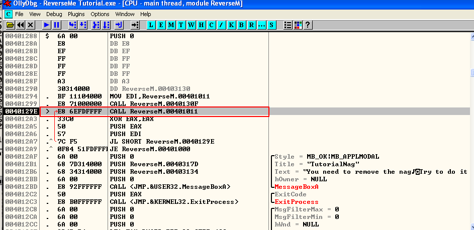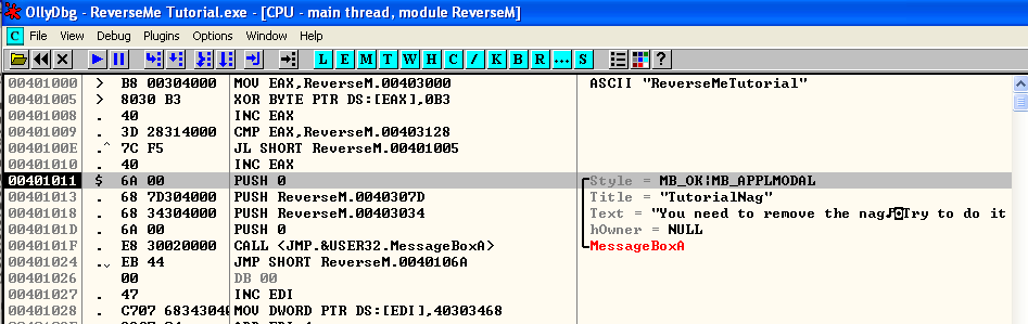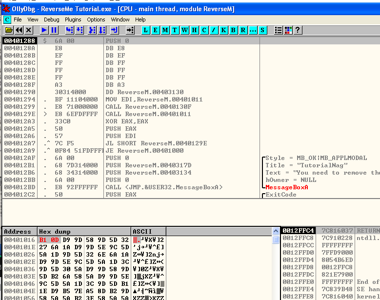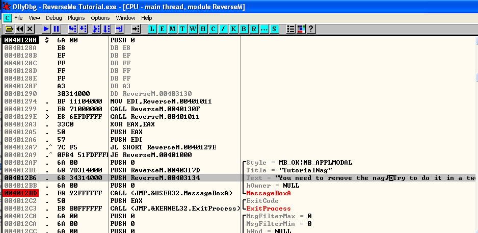 올리디버그로 열었는데 바로 밑에 우리가 원하는 nag 메시지 박스가 있는걸 볼 수 있다.