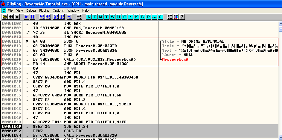401011로 가면 message box가 없다..?! 코드를 열심히 꼬아놨다는 사실을 알 수 있는 코드이다.
