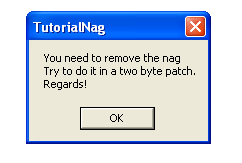 메시지를 보면 "nag을 제거하는데 두 개의 바이트를 패치해서 없앨 방법을 찾아내라"라고 적혀있다.