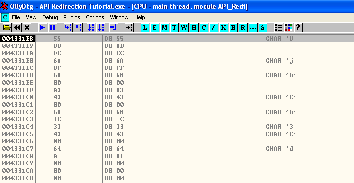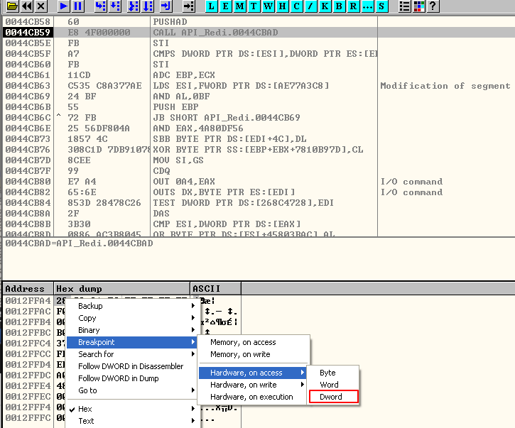 F9을 눌러서 실행시켜주면 우리가 걸었던 하드웨어 브레이크 포인트거가 걸린다.