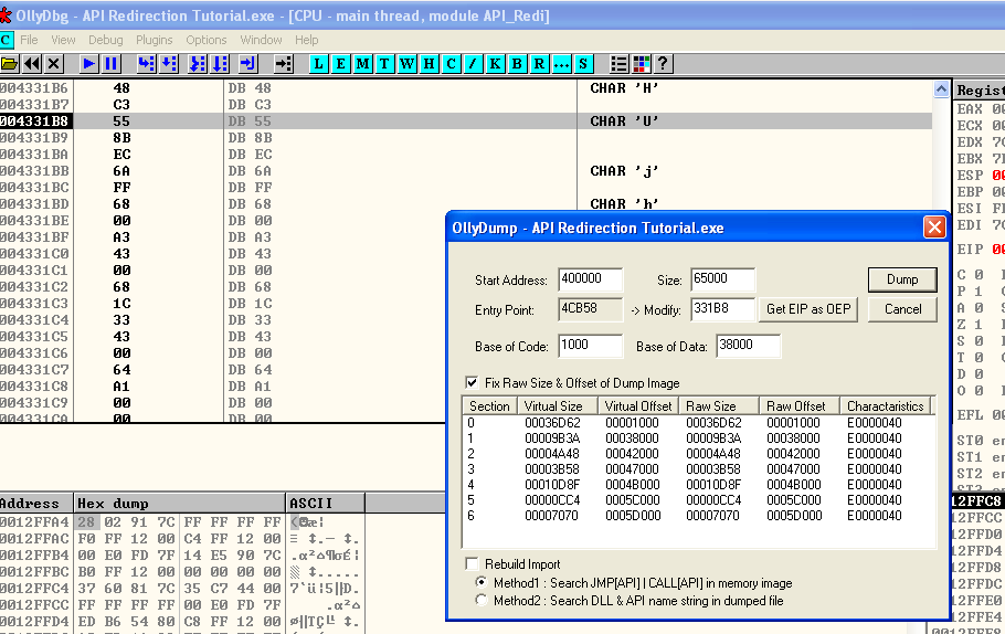 CALL EAX에 들어가서 보면 PUSH EB가 원래 보여야한다....뭐지,..하여튼 여기는 함수의 프로로그를 나타내는 구간이기에 플러그인으로 덤프를 떠준다,.!