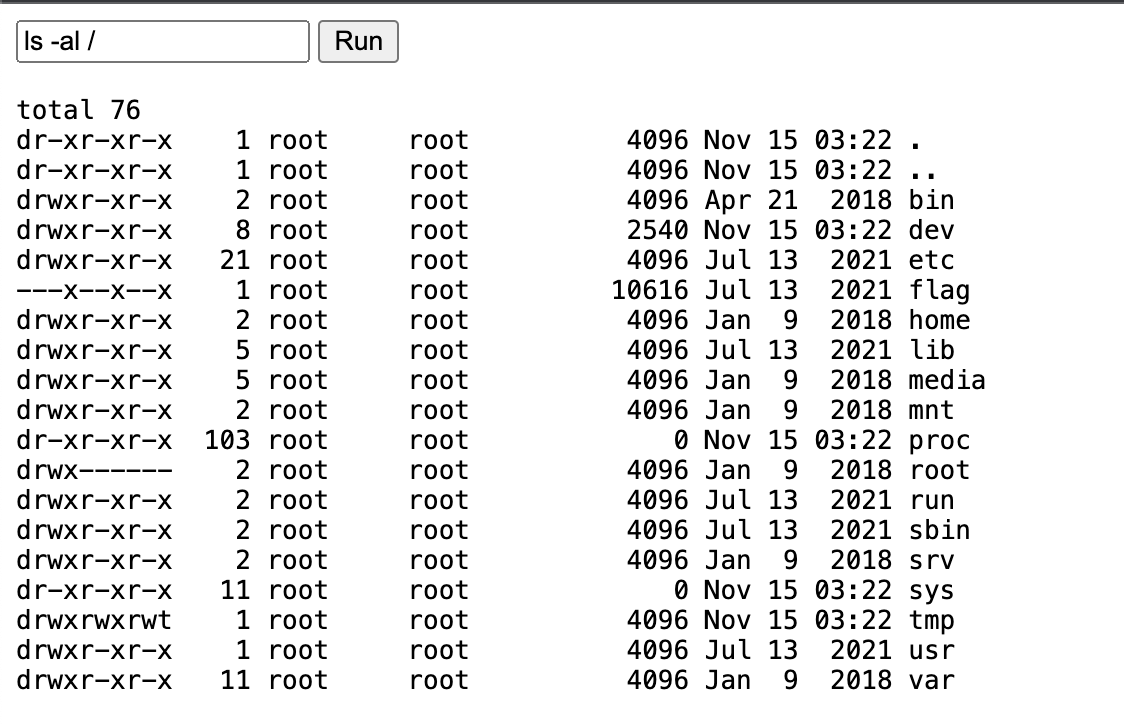 정상적으로 명령어가 실행이 되고, root 디렉터리에 flag 파일이 있는 걸 확인할 수 있다.
