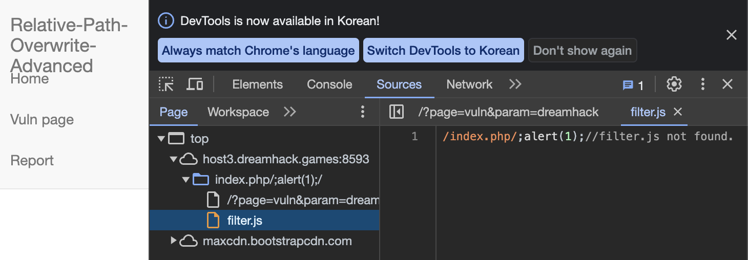 script가 실행이 되는 이유는 로드되는 filter.js파일이 /index.php/;alert(1); 파일이 되어 버리기 때문이다.
