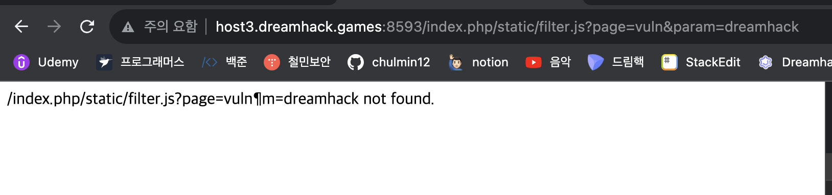 404.php의 역할은 filter.js를 잘못된 경로로 요청을 했을 때 아래처럼 not found를 반환한다