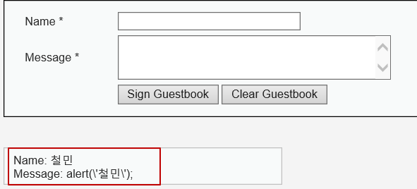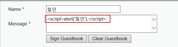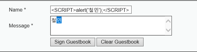 name 박스에 <SCRIPT> alert('철민');</SCRIPT>를 입력해보자.