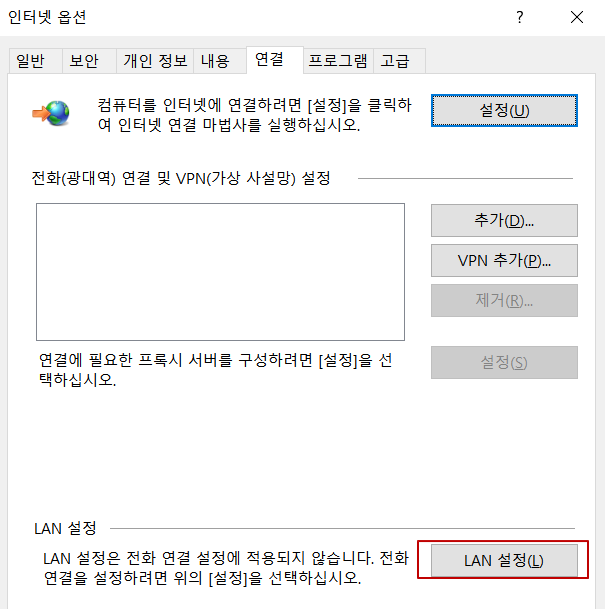 인터넷 옵션에 들어가 LAN 설정을 클릭한다.