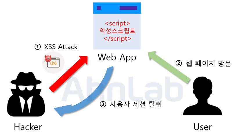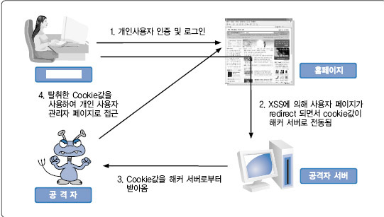 방문자가 웹 브라우저에 스크립트가 있는 페이지를 방문을 하면 스크립트가 실행이되면서 방문자 쿠키를 공격자 컴퓨터로 보내진다. 공격자는 그 쿠키로 방문자 아이디로 로그인이 가능하다.