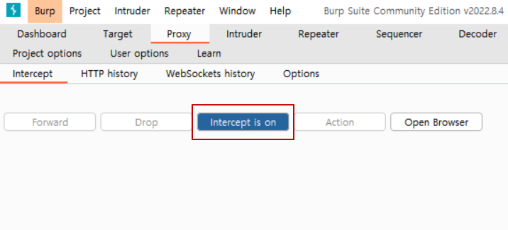 버프 스위트에서 프록시에 들어가 인터셉트를 온으로 해준다.