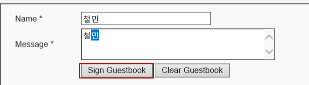 Name, Message에 아무 말이나 입력을 한 뒤 Sign Guestbook 버튼을 눌러준다.