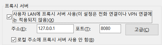 프록시 서버 IP를 127.0.0.1 지정하고 포트는 8080을 사용한다.