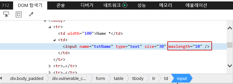 F12를 눌러 개발자 모드에 들어가서 name 박스에 maxlength 길이를 수정해준다.
