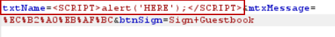 txtName부분에 <script> alert('HERE');</script> 구문을 넣고 확인해 보자.