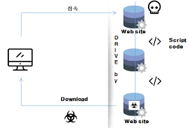 원리는 사용자가 취약점이 있는 웹 사이트에 들어가면 스크립트 코드 등을 이용하여 악성 코드가 있는 웹으로 이동시킨다. 이때 자기도 모르게 다운로드를 하게 된다. 악성코드가 실행되면 랜섬웨어 또는 트로이목마가 동작할 수도 있다.