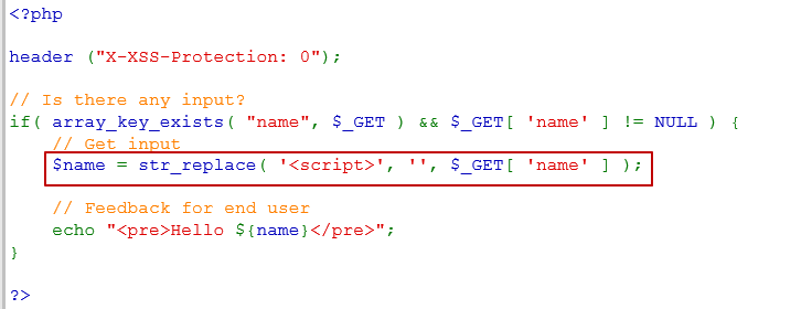 View Source 를 눌러서 소스코드를 보면 str_replace() 함수가 <script>를 Null 값으로 치환을 하고 있다.