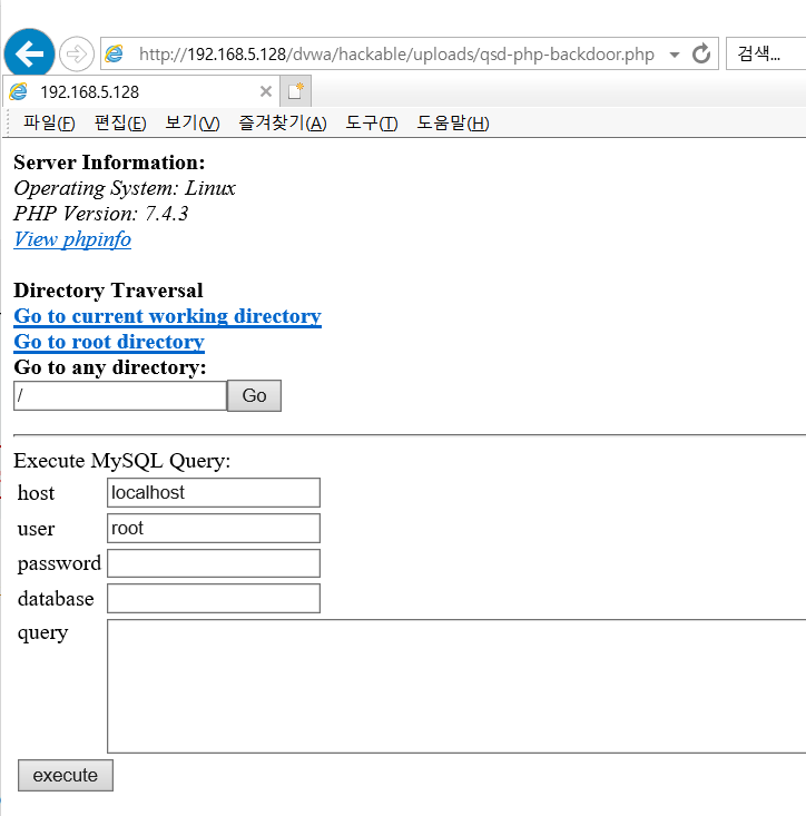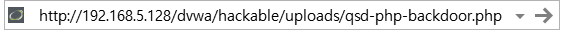 URL창에 ../../(두 수준 올린다) http://192.168.5.128/dvwa/hackable/uploads/qsd-php-backdoor.php 경로로 이동을 한다.