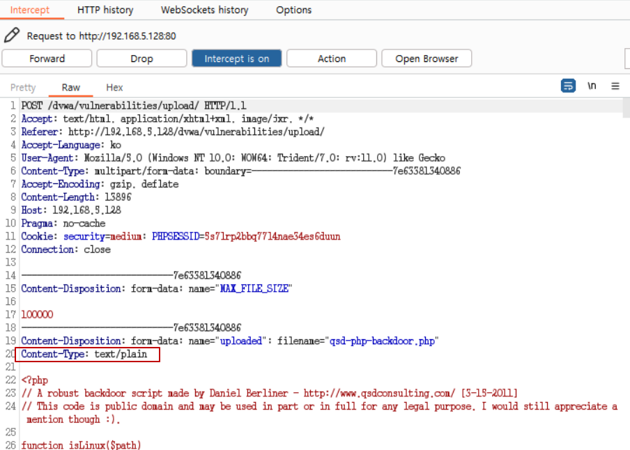 ex) 웹쉘의 Content-Type은 text/plain이지만, Proxy 도구(Burp Suite)를 이용해서 image/jpeg라고 속인다.