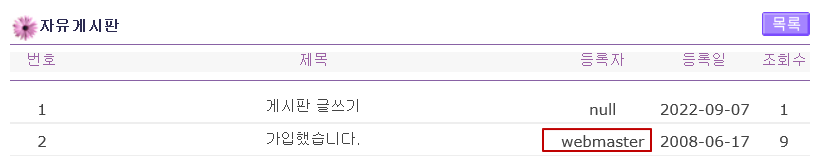 로그인을 하려면 먼저 계정을 알아야 한다. 자유게시판을 가보니 webmaster라는 계정이 있다. 이 계정을 이용해 로그인을 해보자.