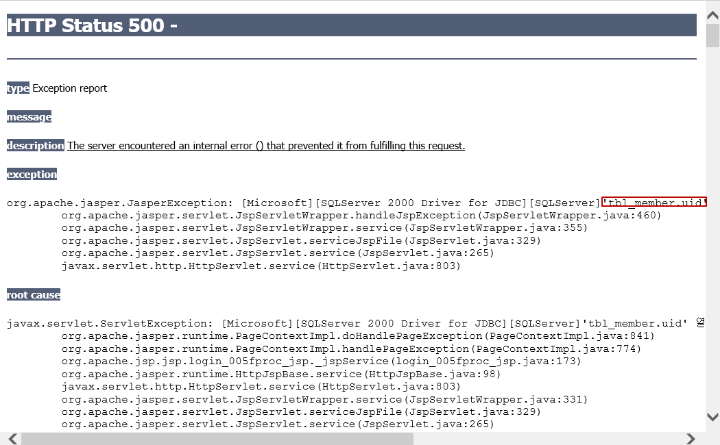 에러 페이지를 보면 tbl_member.uid, tbl_member.userid, tbl_member.passwd, tbl_member.username 이런 식으로 테이블명, 컬럼명을 알 수가 있다.