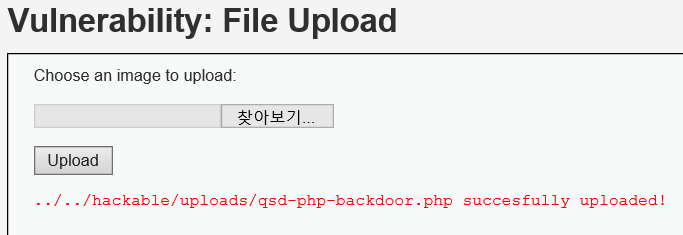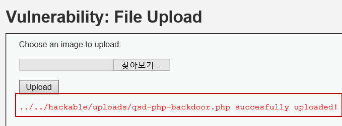 웹쉘 파일(강사님이 제공해주심)을 업로드하니../../hackable/uploads/qsd-php-backdoor.php 에 올라갔다는 경로가 표시가 되었다.(../는 한수 준 위로 올라가라는 의미이다.)