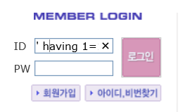 로그인 창에 'having 1=1-- 을 입력 시 에러가 나온다. (having을 사용하려면 앞에 group by가 있어야 한다.)
