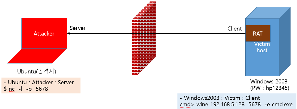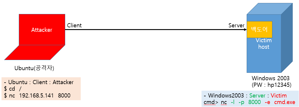 미리 Victim의 관리자 PW 등을 알아낸 후, Victim host에 백도어를 실행하고 Attacker는 Victim host의 Backdoor에 접근해서 연결하는 방식이다.