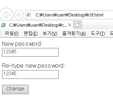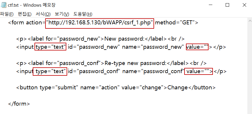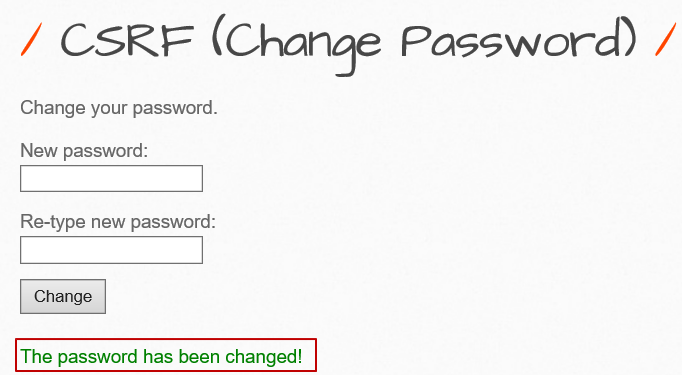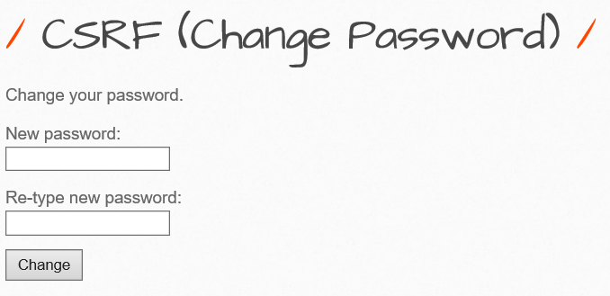 | <form action="http://192.168.5.130/bWAPP/csrf_1.php" method="GET"> <p><label for="password_new">New password:</label><br /> <input type="text" id="password_new" name="password_new" value=""></p> <p><label for="password_conf">Re-type new password:</label><br /> <input type="text" id="password_conf" name="password_conf" value=""></p> <button type="submit" name="action" value="change">Change</button> </form> |