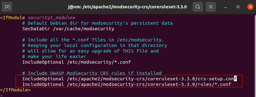 | • Modescurity 설정 sudo vi /etc/apache2/mods-enabled/security2.conf // 9번 라인은 변경할 필요 없음, 12~13번 라인 변경 |