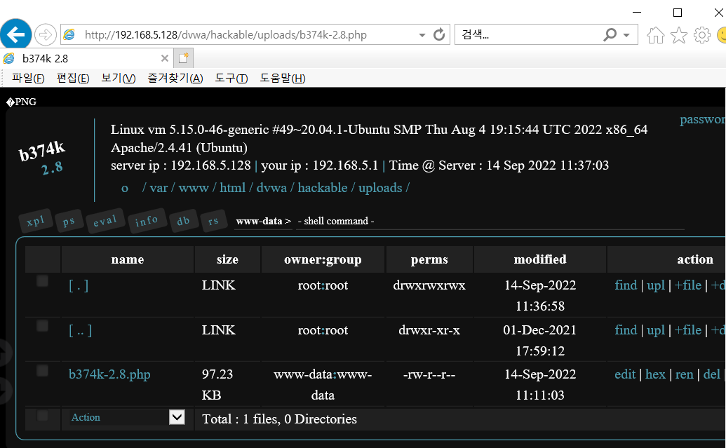 http://192.168.5.128/dvwa/hackable/uploads/b374k-2.8.php 를 사용해 png 파일을 php 확장자로 변경을 해주자.