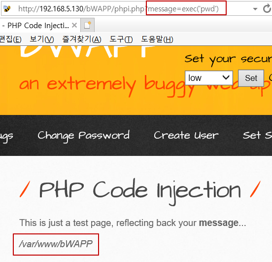 웹브라우저에서 PHP 코드 입력을 정상적으로 인식하여 내부에 있는 PHP 코드를 실행하는 기법이다.