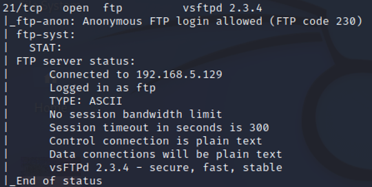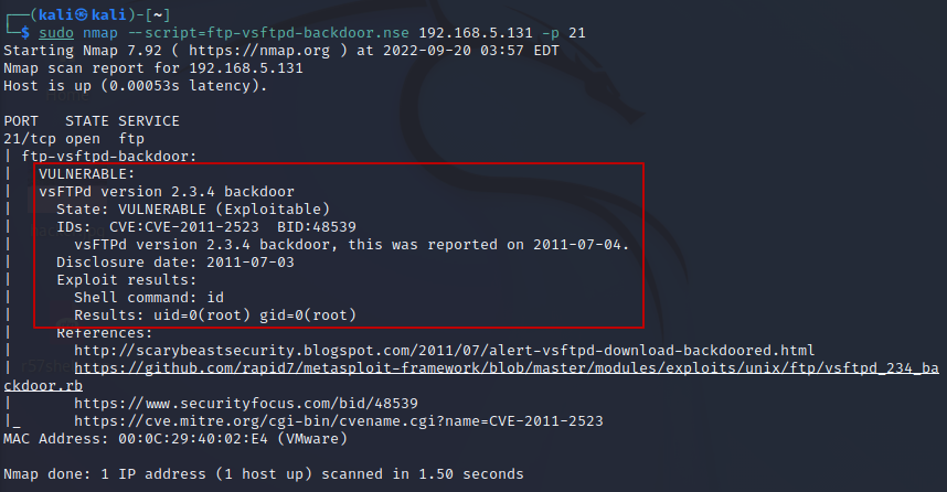 vsftpd2.3.4 버전에 공격이 가능한지 확인하는 nmap 명령어이다.