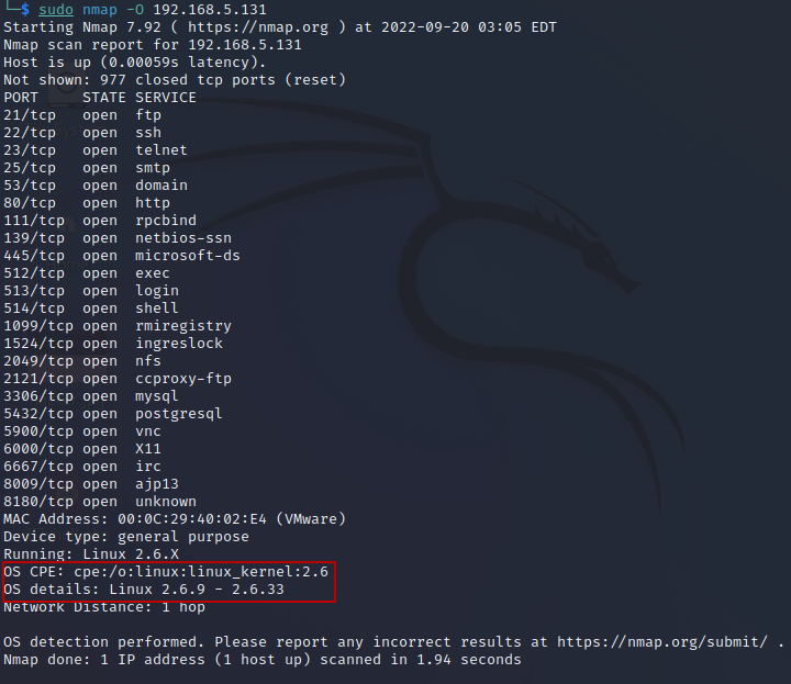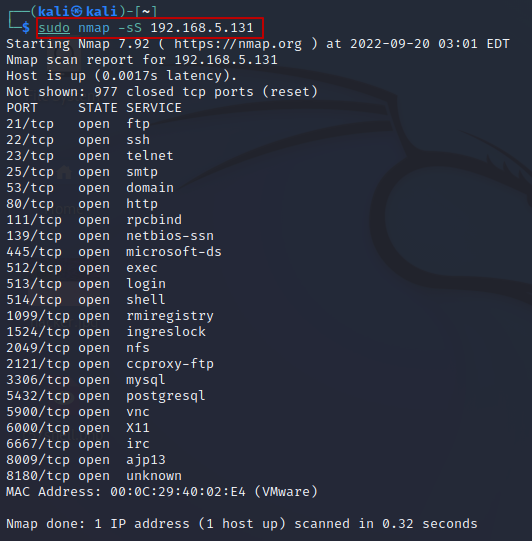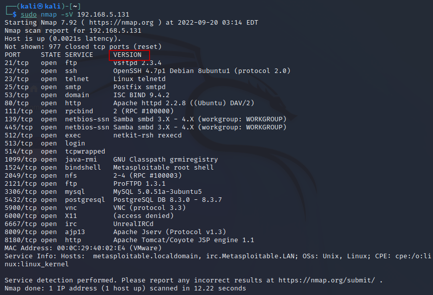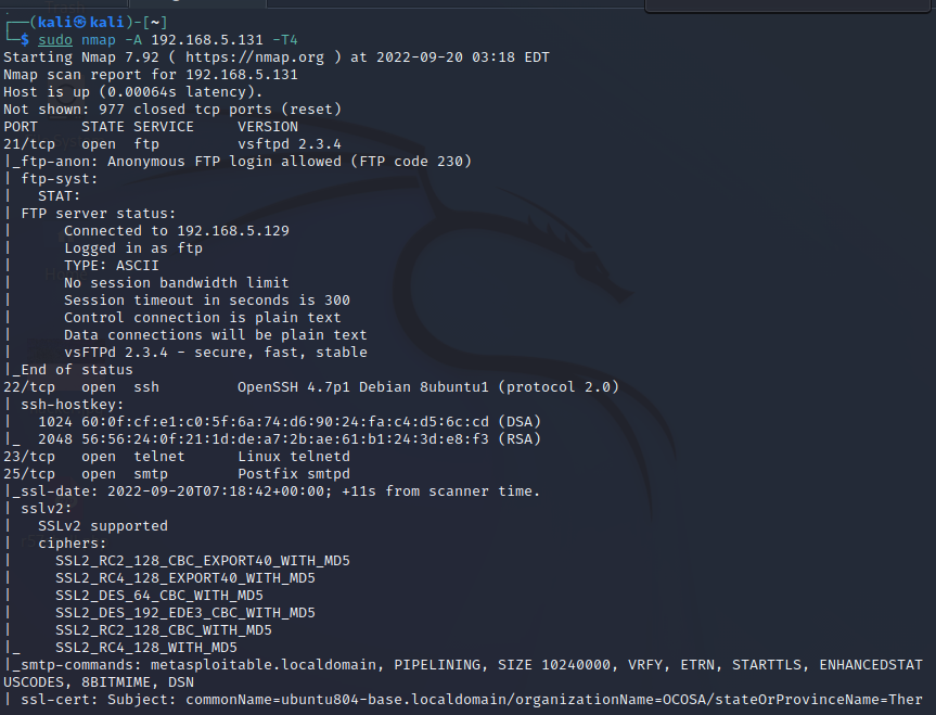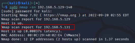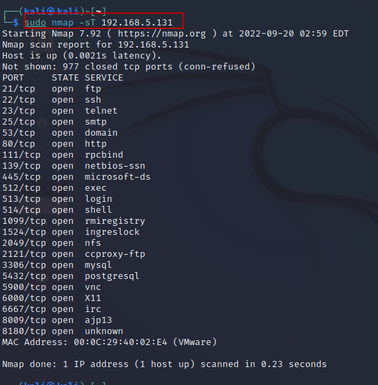| Kali : 192.168.5.129 | metasploitable2 : 192.168.5.131 |